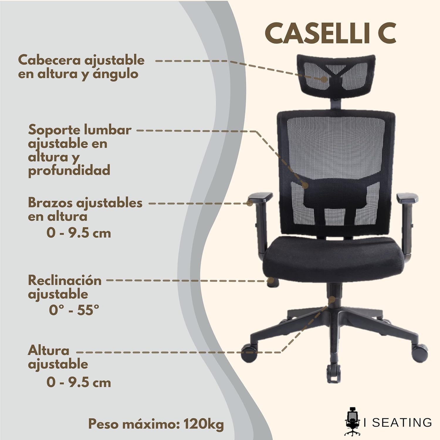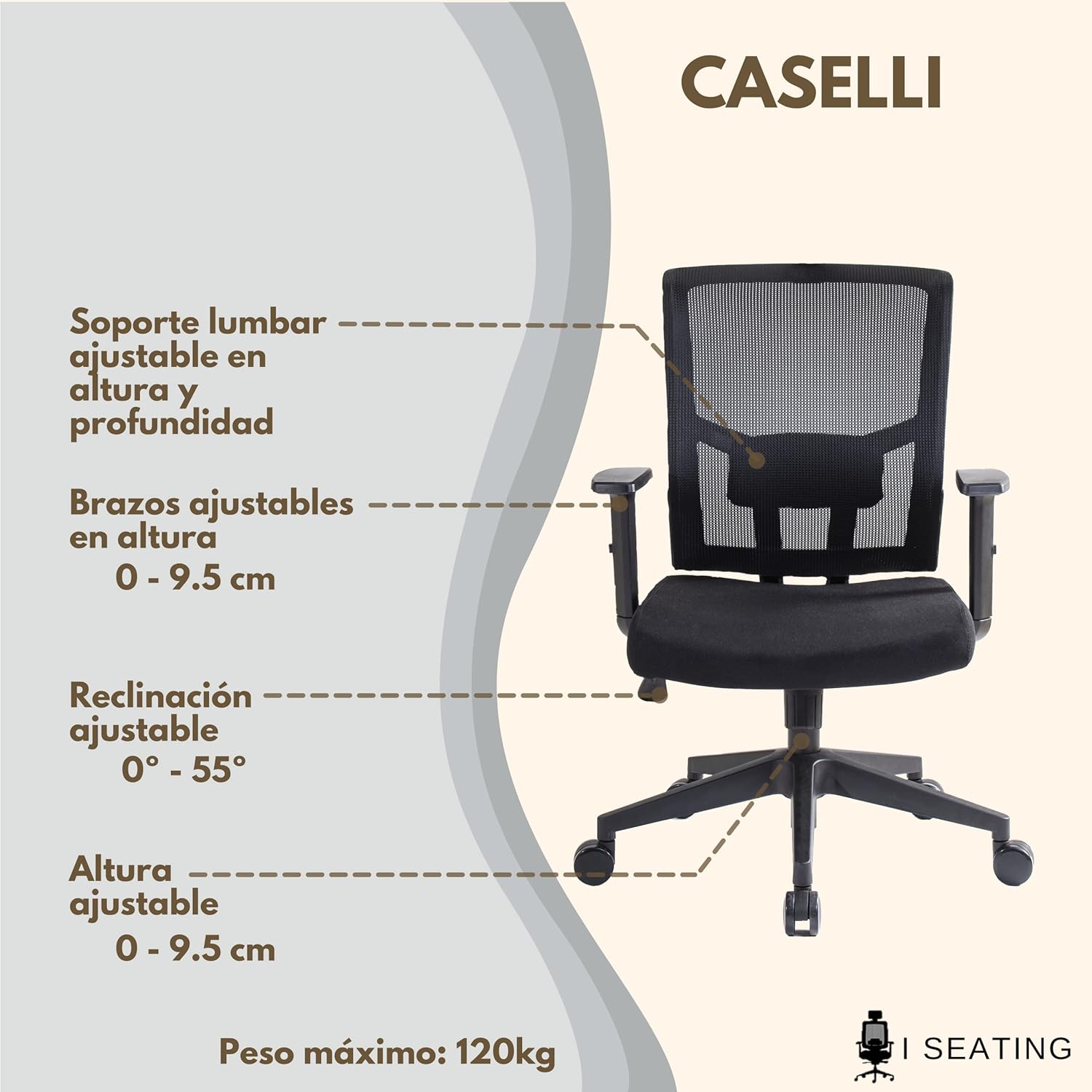 Marca I SEATING Número de modelo 1 Color Negro Dimensiones del producto 29,5 x 59 x 70 cm; 12 kg Características especiales Rodante, Ergonómico Peso del producto 12 Kilograms